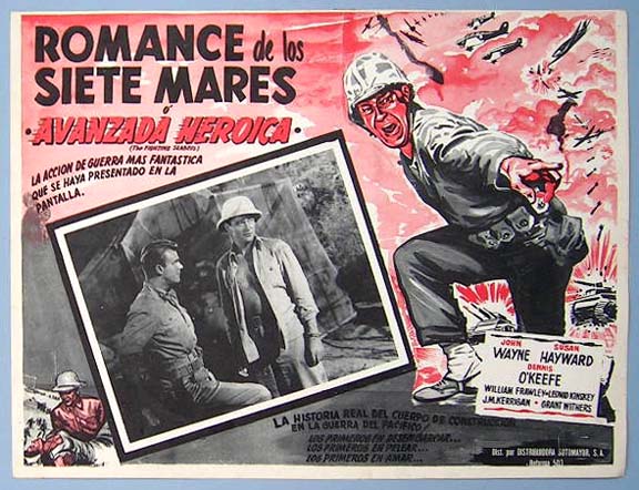 Beautiful Mexican jumbo lobby card (12.5x16.5") from the 1944 Republic World War 2 film, THE FIGHTING SEABEES which starred John Wayne, Susan Hayward, Dennis O'Keefe and William Frawley. $20 each |