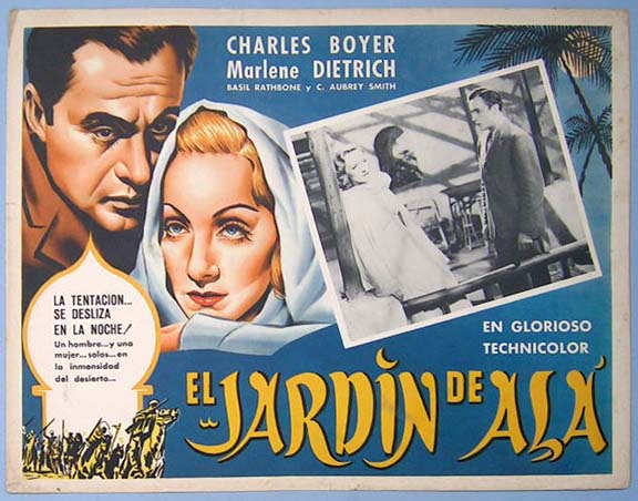 Beautiful Mexican jumbo lobby card (12.5x16.5") from the 1936 United Artists romantic adventure film, THE GARDEN OF ALLAH, which starred Marlene Dietrich, Charles Boyer, Basil Rathbone, C. Aubrey Smith and Tilly Losch. $35 each |