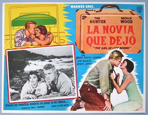 Beautiful Mexican jumbo lobby card (12.5x16.5") from the 1956 Warner Brothers comedy / romance film, THE GIRL HE LEFT BEHIND, which starred Tab Hunter, Natalie Wood, Jessie Royce Landis, Jim Backus and Henry Jones. $20 each |