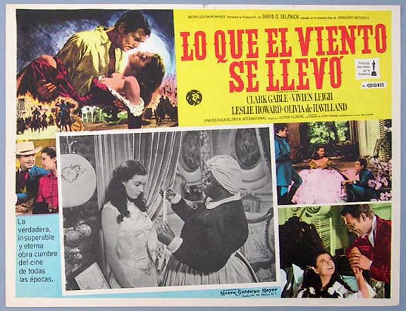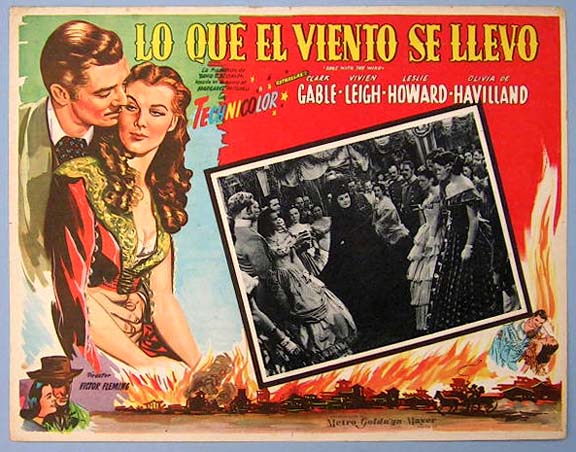 Beautiful Mexican jumbo lobby card (12.5x16.5") from the 1939 MGM Civil War / romance film, GONE WITH THE WIND, which starred Clark Gable, Vivien Leigh, Leslie Howard, Olivia de Havilland, Thomas Mitchell, Barbara O'Neil, Evelyn Keyes, Ann Rutherford and George Reeves. $85 each |