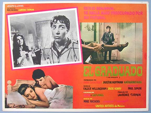 Beautiful Mexican jumbo lobby card (12.5x16.5") from the 1967 Avco Embassy comedy film, THE GRADUATE, which starred Anne Bancroft, Dustin Hoffman, Katharine Ross, William Daniels and Murray Hamilton. $15 each |