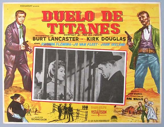 Beautiful Mexican jumbo lobby card (12.5x16.5") from the 1957 Paramount western film, GUNFIGHT AT THE OK CORRAL, which starred Burt Lancaster, Kirk Douglas, Rhonda Fleming, Jo van Fleet, John Ireland, Lyle Bettger and Lee van Cleef. $25 each |