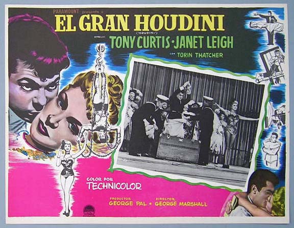 Beautiful Mexican jumbo lobby card (12.5x16.5") from the 1953 Paramount magician / biography film, HOUDINI, which starred Tony Curtis, Janet Leigh, Torin Thatcher, Angela Clarke, Stefan Schnabel and Ian Wolfe. $45 each |