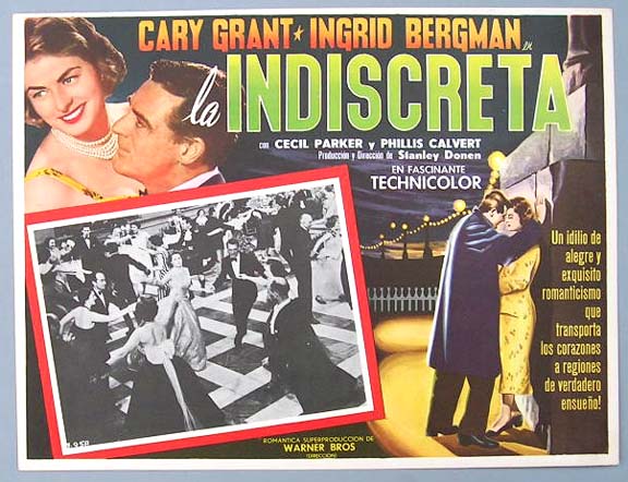 Beautiful Mexican jumbo lobby card (12.5x16.5") from the 1958 Warner Brothers comedy film, INDISCREET, which starred Cary Grant, Ingrid Bergman, Cecil Parker and Phyllis Calvert. $25 each |