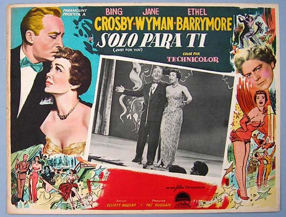 Beautiful Mexican jumbo lobby card (12.5x16.5") from the 1952 Paramount musical / comedy film, JUST FOR YOU, which starred Bing Crosby, Jane Wyman, Ethel Barrymore, Robert Arthur and Natalie Wood. $20 each |
