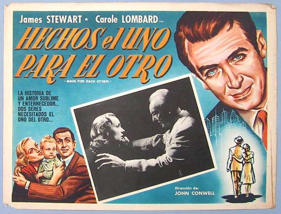 Beautiful Mexican jumbo lobby card (12.5x16.5") from the 1939 United Artists comedy / drama / romance film, MADE FOR EACH OTHER, which starred Carole Lombard, James Stewart, Charles Coburn, Lucile Watson and Eddie Quillan. $35 each |