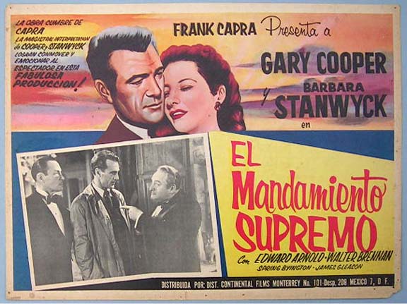 Beautiful Mexican jumbo lobby card (12.5x16.5") from the 1941 Warner Brothers film, MEET JOHN DOE, which starred Gary Cooper, Barbara Stanwyck, Edward Arnold, Walter Brennan, James Gleason, Gene Lockhart and Rod La Rocque. $25 each |