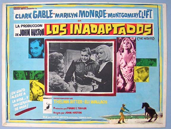 Beautiful Mexican jumbo lobby card (12.5x16.5") from the 1961 United Artists western / drama / comedy film, THE MISFITS, which starred Clark Gable, Marilyn Monroe, Montgomery Clift, Thelma Ritter and Eli Wallach. $35 each |