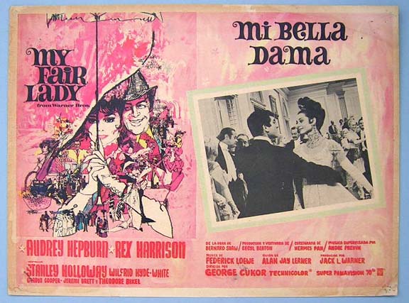 Beautiful Mexican jumbo lobby card (12x16") from the 1964 Warner Brothers musical film, MY FAIR LADY, which starred Audrey Hepburn, Rex Harrison, Stanley Holloway, Wilfrid Hyde-White, Gladys Cooper and Jeremy Brett. $20 each |