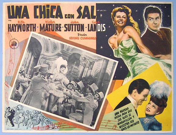 Beautiful Mexican jumbo lobby card (12.5x16.5") from the 1942 20th Century Fox musical / biographical film, MY GAL SAL, which starred Rita Hayworth, Victor Mature, John Sutton, Carole Landis, and James Gleason. $25 each |