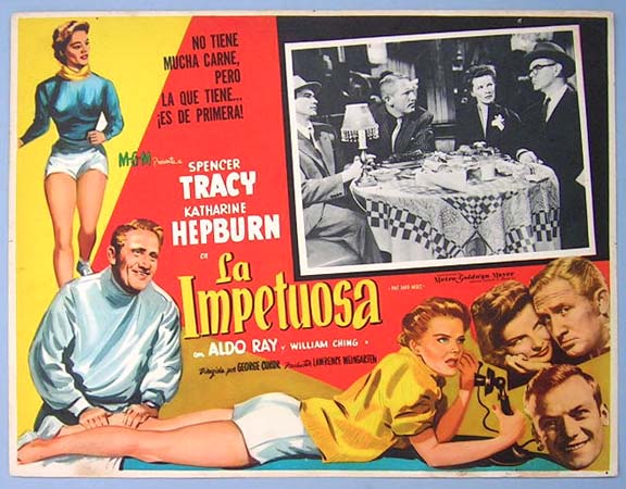 Beautiful Mexican jumbo lobby card (12.5x16.5") from the 1952 MGM comedy / romance / sports film, PAT AND MIKE, which starred Spencer Tracy, Katharine Hepburn, Aldo Ray and William Ching. $25 each |