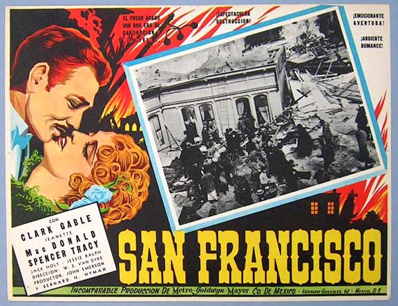 Beautiful Mexican jumbo lobby card (12.5x16.5") from the 1936 MGM romance / adventure film, SAN FRANCISCO, which starred Clark Gable, Jeanette MacDonald, Spencer Tracy, Jack Holt, Jessie Ralph, Ted Healy and Shirley Ross. $35 each |