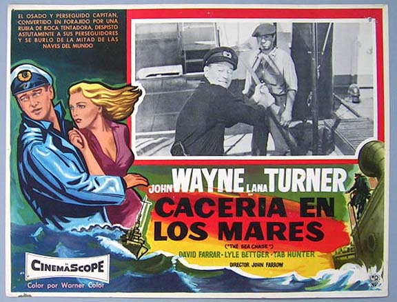 Beautiful Mexican jumbo lobby card (12.5x16.5") from the 1955 Warner Brothers war film, SEA CHASE, which starred John Wayne, Lana Turner, David Farrar, Lyle Bettger, Tab Hunter and James Arness. $20 each |