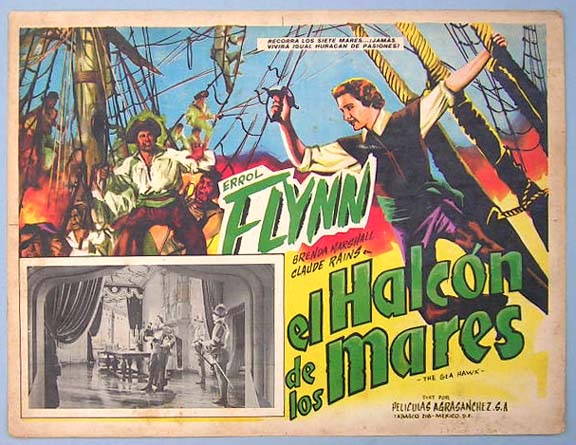 Beautiful Mexican jumbo lobby card (12.5x16.5") from the 1940 Warner Brothers adventure / romance film, THE SEA HAWK, which starred Errol Flynn, Brenda Marshall, Claude Rains, Donald Crisp, Flora Robson, Alan Hale and Henry Daniell. $20 each |