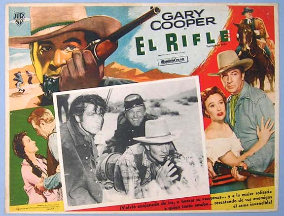 Beautiful Mexican jumbo lobby card (12.5x16.5") from the 1952 Warner Brothers film, SPRINGFIELD RIFLE, which starred Gary Cooper, Phyllis Thaxter, David Brian, Paul Kelly, Lon Chaney Jr., Philip Carey and Guinn 'Big Boy' Williams. $20 each |