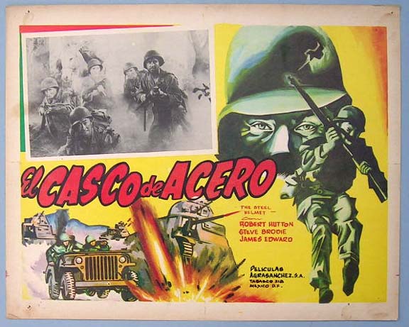 Beautiful Mexican jumbo lobby card (12.5x16.5") from the 1951 Lippert Korean war film, THE STEEL HELMET, which starred Gene Evans, Robert Hutton, Steve Brodie, James Edwards and Richard Loo. The film was directed by Samuel Fuller. (The border art is probably by Aguirre.) $25 each |