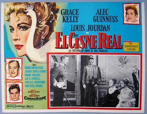 Beautiful Mexican jumbo lobby card (12.5x16.5") from the 1956 MGM romantic comedy film, THE SWAN, which starred Grace Kelly, Alec Guinness, Louis Jourdan, Agnes Moorehead, Jessie Royce Landis and Brian Aherne. The card has no border along the top, but it is NOT trimmed, this was the way it was produced. Otherwise, it is crisp and bright. $15 each |