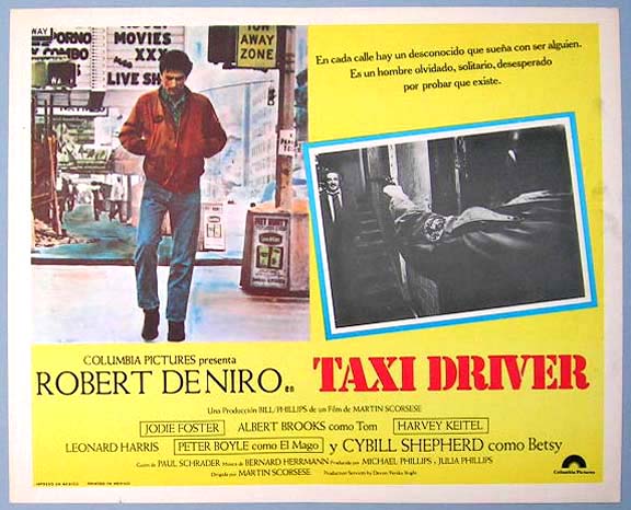 Beautiful Mexican lobby card (11x14") from the 1976 Columbia cult crime film, TAXI DRIVER, which starred Robert De Niro, Cybill Shepherd, Peter Boyle, Jodie Foster and Harvey Keitel. The film was directed by Martin Scorsese. $20 each |