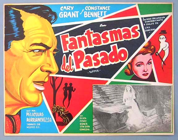 Beautiful Mexican jumbo lobby card (12.5x16") from the 1937 Hal Roach / MGM comedy / fantasy film, TOPPER, which starred Constance Bennett, Cary Grant, Roland Young, Billie Burke, Alan Mowbray and Eugene Pallette. This card is likely from a reissue of the film -- possible in the early 1960s. $15 each |