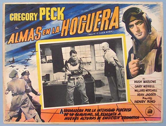 Beautiful Mexican jumbo lobby card (12.5x16.5") from the 1949 20th Century Fox WW2 / aviation film, TWELVE O'CLOCK HIGH, which starred Gregory Peck, Hugh Marlowe, Gary Merrill, Millard Mitchell and Dean Jagger. $25 each |