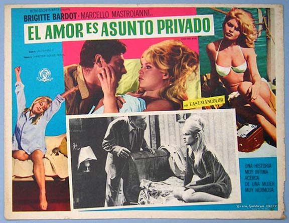 Beautiful Mexican jumbo lobby card (12.5x16.5") from the 1962 MGM / French film, A VERY PRIVATE AFFAIR, which starred Brigitte Bardot, Marcello Mastroianni, Nicolas Bataille, Dirk Sanders and Jacqueline Doyen. The card has some edge wear and creasing at a corner, but these flaws do not greatly detract from the colorful image area. $20 each |
