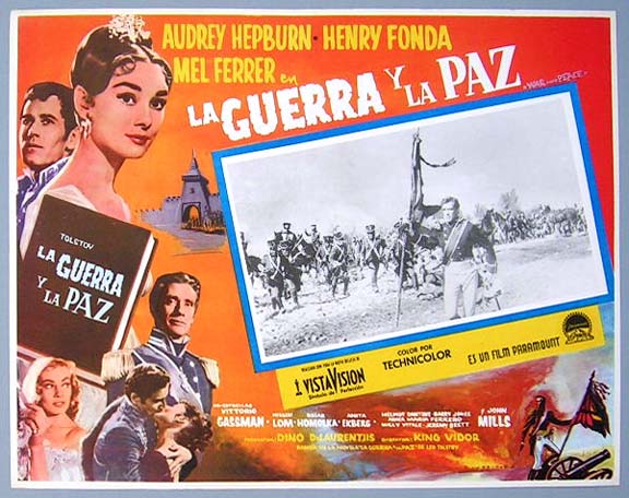 Beautiful Mexican lobby card (11x14") from the 1956 Paramount historical film, WAR AND PEACE, which starred Audrey Hepburn, Henry Fonda, Mel Ferrer, Vittorio Gassman, Herbert Lom and Oskar Homolka. $20 each |