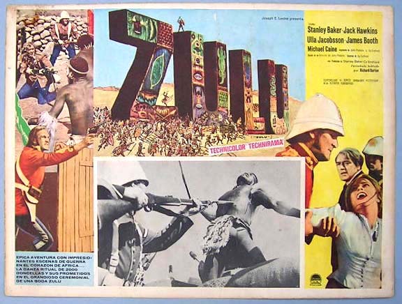 Beautiful Mexican jumbo lobby card (12.5x16.5") from the 1964 Paramount adventure film, ZULU, which starred Stanley Baker, Jack Hawkins, Ulla Jacobsson, James Booth, Michael Caine and Nigel Green. $25 each |