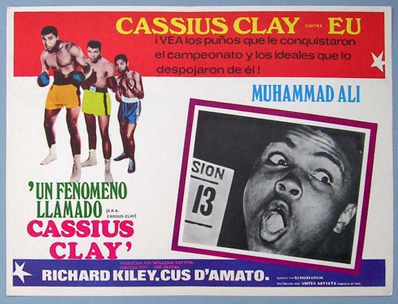 Beautiful Mexican jumbo lobby card (12.5x16.5") from the 1970 United Artists boxing documentary film, AKA CASSIUS CLAY, which featured appearances by Muhammad Ali, Cus D'Amato, Richard Kiley, Angelo Dundee and Sonny Liston. $25 each