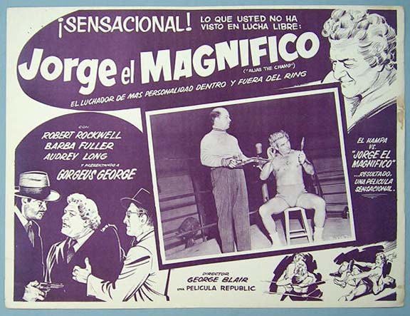Beautiful Mexican jumbo lobby card (12.5x16.5") from the 1949 Republic wrestling / crime film, ALIAS THE CHAMP, which starred Gorgeous George, Robert Rockwell, Barbra Fuller, Audrey Long and Tor Johnson. $20 each