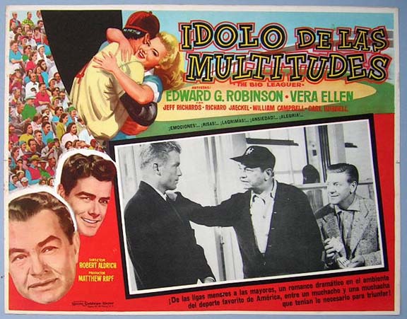 Beautiful Mexican jumbo lobby card (12.5x16.5") from the 1953 MGM baseball film, BIG LEAGUER, which starred Edward G. Robinson, Vera-Ellen, Jeff Richards, Richard Jaeckel, Carl Hubbell and Al Campanis. $20 each