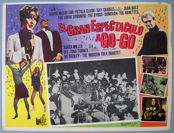 Beautiful Mexican jumbo lobby card (12.5x16.5") from the 1966 AIP rock 'n roll / music / documentary film, THE BIG T.N.T. SHOW, which starred David McCallum, Joan Baez, The Byrds, Ray Charles, Petula Clark, Bo Diddley, Donovan, Lovin' Spoonful, Roger Miller, The Modern Folk Quartet, The Ronettes, Ike and Tina Turner, The Seeds and Phil Spector. $25 each