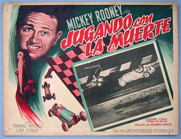 Beautiful Mexican jumbo lobby card (12.5x16.5") from the 1949 United Artists Indianapolis 500 / auto racing film, THE BIG WHEEL, which starred Mickey Rooney, Thomas Mitchell, Mary Hatcher, Michael O'Shea and Spring Byington. $35 each
