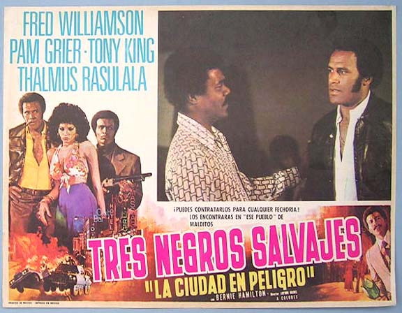 Beautiful Mexican jumbo lobby card (12.5x16.5") from the 1975 AIP Blaxploitation film, BUCKTOWN, which starred Fred Williamson, Pam Grier, Thalmus Rasulala, Tony King and Bernie Hamilton. $20 each