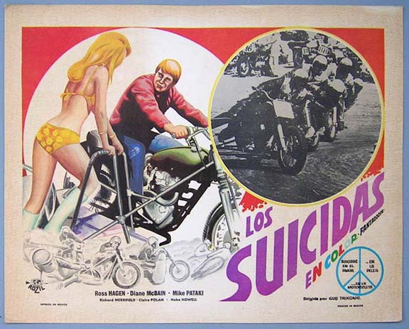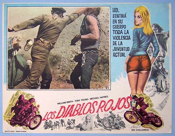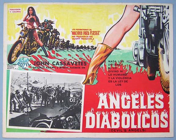 Beautiful Mexican jumbo lobby card (12.5x16.5") from the 1967 AIP biker / JD / crime film, THE DEVIL'S ANGELS, which starred John Cassavetes, Beverly Adams, Mimsy Farmer, Maurice McEndree, Leo Gordon and Russ Bender. $20 each