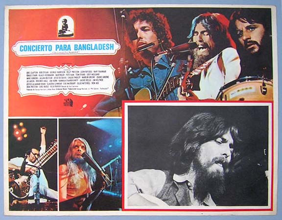 Beautiful Mexican jumbo lobby card (12.5x16.5") from the 1972 20th Century Fox rock 'n roll / music / documentary film, THE CONCERT FOR BANGLADESH, which starred George Harrison, Bob Dylan, Ravi Shankar, Ringo Starr, Eric Clapton, Leon Russell, Billy Preston, Klaus Voormann, Jim Keltner, Pete Ham and Phil Spector. The film was directed by Saul Swimmer. $25 each