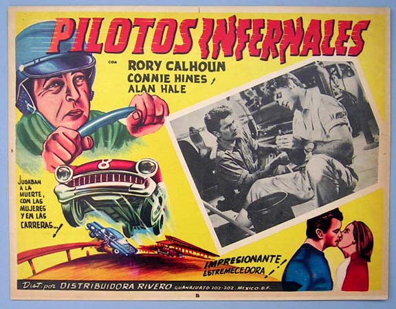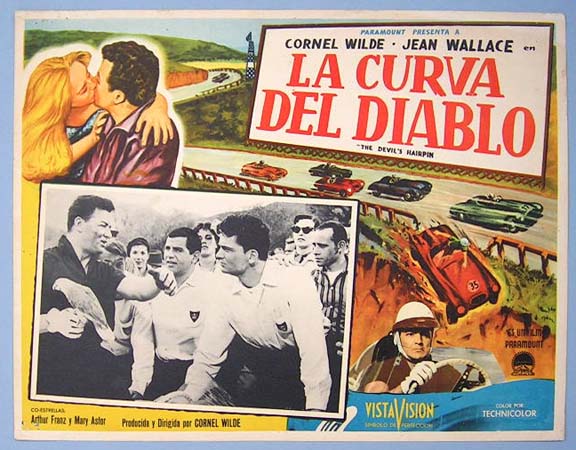 Beautiful Mexican jumbo lobby card (12.5x16.5") from the 1957 Paramount auto racing film, DEVIL'S HAIRPIN, which starred Cornel Wilde, Jean Wallace, Arthur Franz, Mary Astor and Paul Fix. $25 each