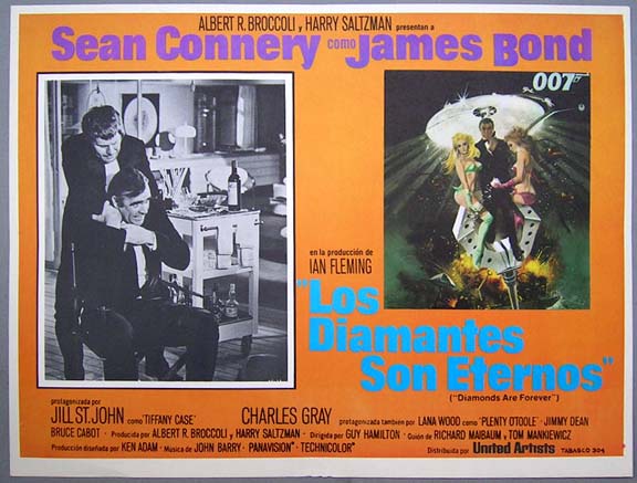 Beautiful Mexican jumbo lobby card (12.5x16.5") from the 1971 United Artists James Bond / spy film, DIAMONDS ARE FOREVER, which starred Sean Connery, Jill St. John, Charles Gray, Lana Wood and Jimmy Dean. $25 each