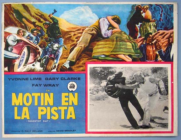 Beautiful Mexican lobby card (11x14.5") from the 1958 AIP hot rod / JD film, DRAGSTRIP RIOT, which starred Yvonne Lime, Gary Clarke, Fay Wray, Bob Turnbull and Connie Stevens. $20 each