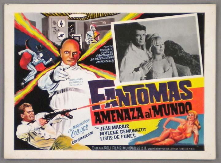 Striking Mexican jumbo lobby card (12x16.5") from the 1965 French adventure / super-villain film, Fantomas Is Unleashed, which starred Jean Marais, Louis de Funes, Mylene Demongeot and Jacques Dynam. $20 each