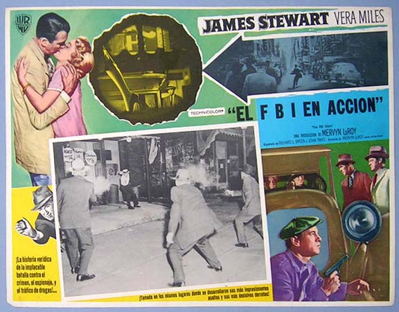 Beautiful Mexican jumbo lobby card (12.5x16.5") from the 1959 Warner Brothers G-men / gangster film, THE FBI STORY, which starred Jimmy Stewart, Vera Miles, Murray Hamilton, Larry Pennell and Nick Adams. $20 each