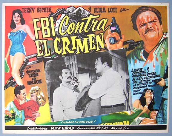Beautiful Mexican jumbo lobby card (12.5x16.5") from the 1961 Sterling crime / G-Men related film, CODE OF SILENCE, which starred Terry Becker, Elisa Loti, Bruno VeSota and Mel Welles. It was also known as, FBI vs. CRIME. $15 each
