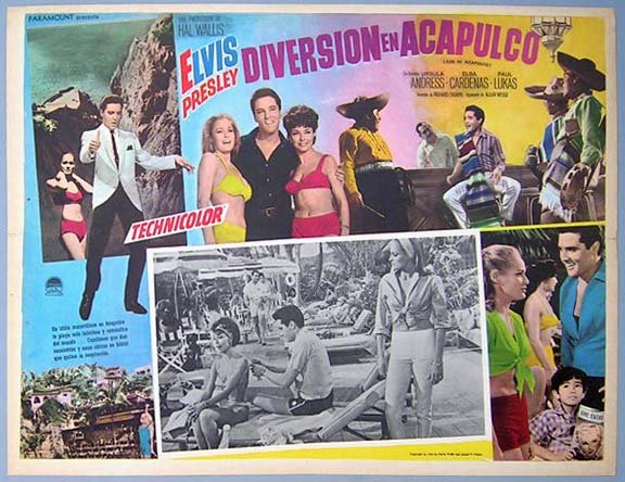 Beautiful Mexican jumbo lobby card (12.5x16.5") from the 1963 Paramount rock 'n roll / romance / comedy film, FUN IN ACAPULCO, which starred Elvis Presley, Ursula Andress, Elsa Cardenas, Paul Lukas, Larry Domasin and Alejandro Rey. $20 each