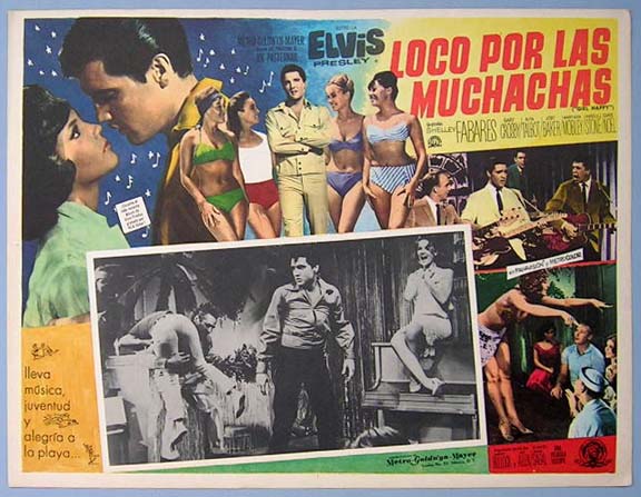 Beautiful Mexican jumbo lobby card (12.5x16.5") from the 1965 MGM music / romance / rock 'n roll film, GIRL HAPPY, which starred Elvis Presley, Shelley Fabares, Harold Stone, Gary Crosby, Joby Baker, Nita Talbot and Mary Ann Mobley. $20 each