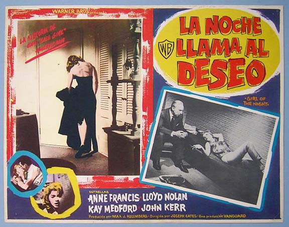 Beautiful Mexican jumbo lobby card (12.5x16.5") from the 1960 Warner Brothers bad girl / exploitation film, GIRL OF THE NIGHT, which starred Anne Francis, Lloyd Nolan, Kay Medford and John Kerr. $20 each