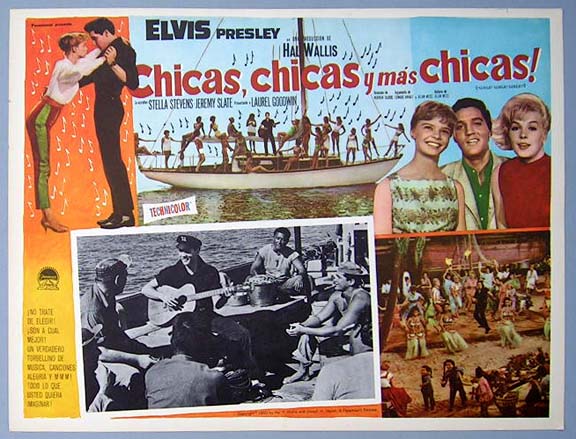 Beautiful Mexican jumbo lobby card (12.5x16.5") from the 1962 Paramount musical / comedy film, GIRLS! GIRLS! GIRLS!, which starred Elvis Presley, Stella Stevens, Jeremy Slate, Laurel Goodwin, Benson Fong and Robert Strauss. $20 each