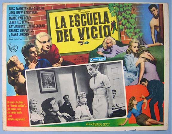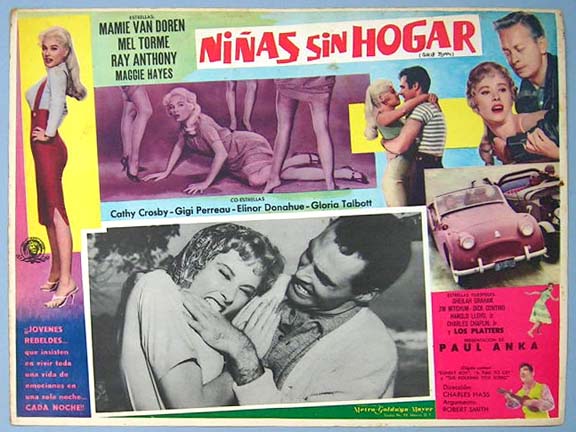 Beautiful Mexican jumbo lobby card (12.5x16.5") from the 1959 MGM JD / bad girl / exploitation film, GIRL'S TOWN, which starred Mamie Van Doren, Mel Torme, Ray Anthony, Margaret Hayes, Paul Anka, Cathy Crosby and Gloria Talbott. $25 each