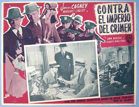 Beautiful Mexican jumbo lobby card (12.5x16.5") from the 1935 Warner Brothers crime / gangster/ FBI related film, G-MEN which starred James Cagney, Margaret Lindsay, Ann Dvorak, Robert Armstrong, Barton MacLane and Lloyd Nolan. $15 each