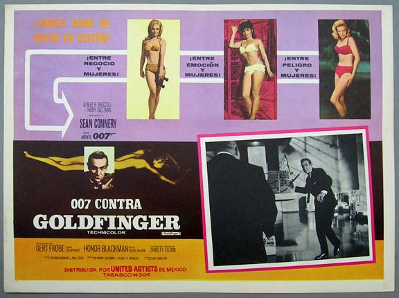 Beautiful Mexican jumbo lobby card (12.5x16.5") from the 1964 United Artists, James Bond / spy / action film, GOLDFINGER, which starred Sean Connery, Gert Frobe, Honor Blackman, Shirley Eaton, Harold Sakata and Bernard Lee. $35 each