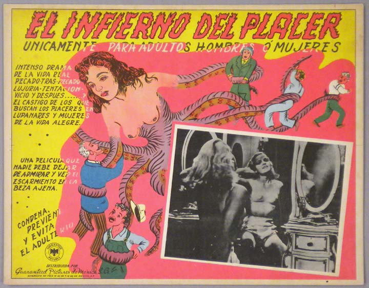 Beautiful Mexican jumbo lobby card (12x15.5") from an unidentified sex / JD / exploitation film, probably produced in the 1930s or early 1940s. We have used a simple translation of the title. Anyone out there know the true title or have any further info on this film? In any case, the lobby card has truly memorable border art. $65