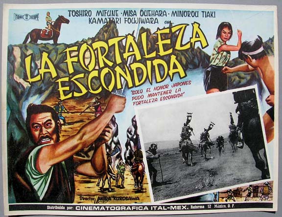 Beautiful Mexican jumbo lobby card (12.5x16.5") from the 1958 Japanese martial arts film, THE HIDDEN FORTRESS, which starred Toshiro Mifune, Misa Uehara, Minoru Chiaki and Kamatari Fujiwara. The film was directed by Akira Kurosawa. $25